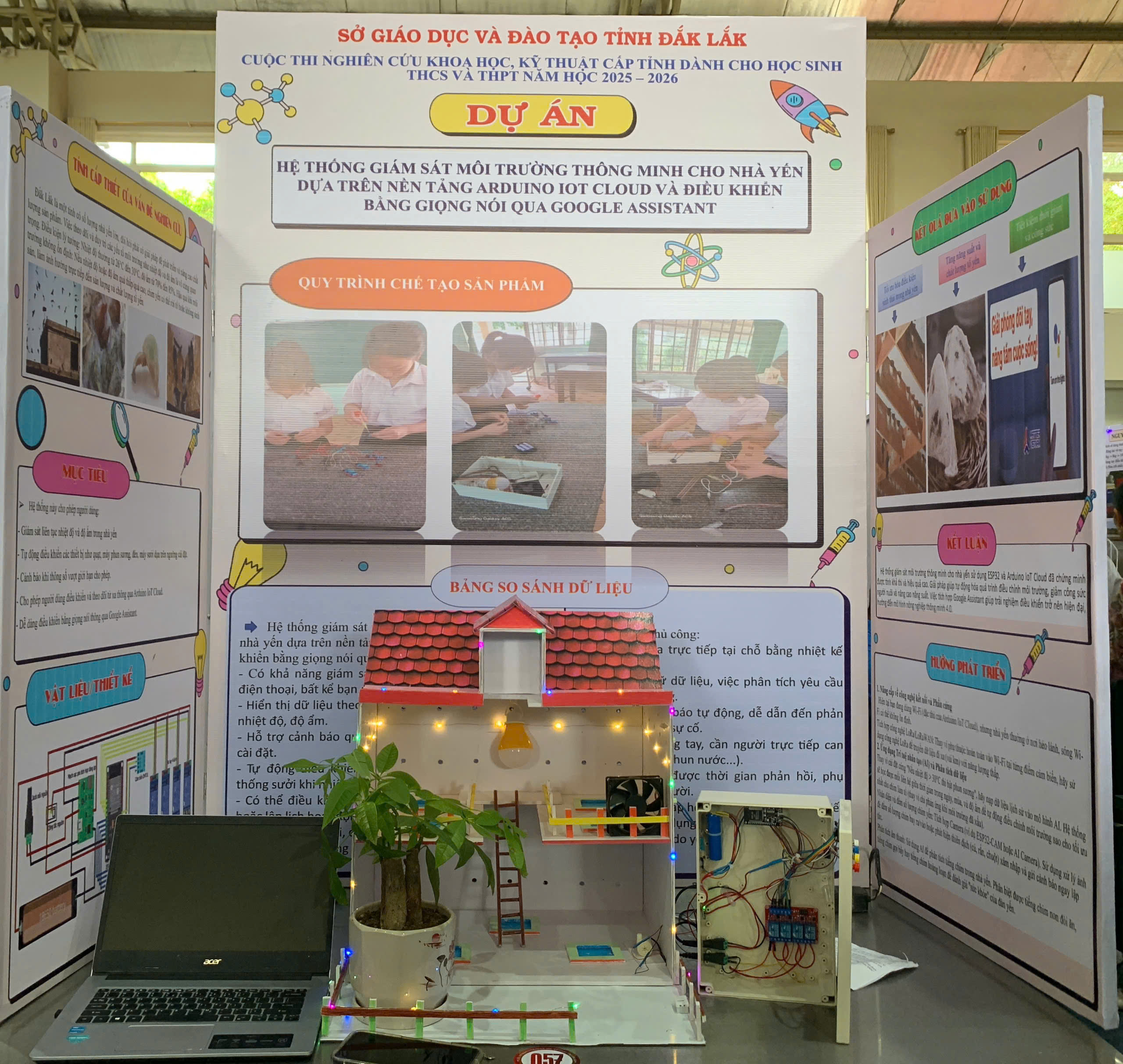 Dự án “Hệ thống giám sát môi trường thông minh cho nhà yến” do hai em học sinh lớp 9A: Phan Thị Tường Vi và Nguyễn Huỳnh Bảo Như thực hiện, dưới sự hướng dẫn tận tâm của thầy giáo Phạm Công Chiến. Xuất phát từ thực tế nhiều nhà yến hiện nay vẫn quản lý môi trường chủ yếu bằng kinh nghiệm thủ công, thiếu sự giám sát liên tục, dễ dẫn đến nhiệt độ, độ ẩm, ánh sáng không phù hợp, ảnh hưởng đến đàn yến và năng suất tổ yến, nhóm học sinh đã mạnh dạn đề xuất giải pháp ứng dụng công nghệ vào theo dõi và kiểm soát môi trường nuôi yến.